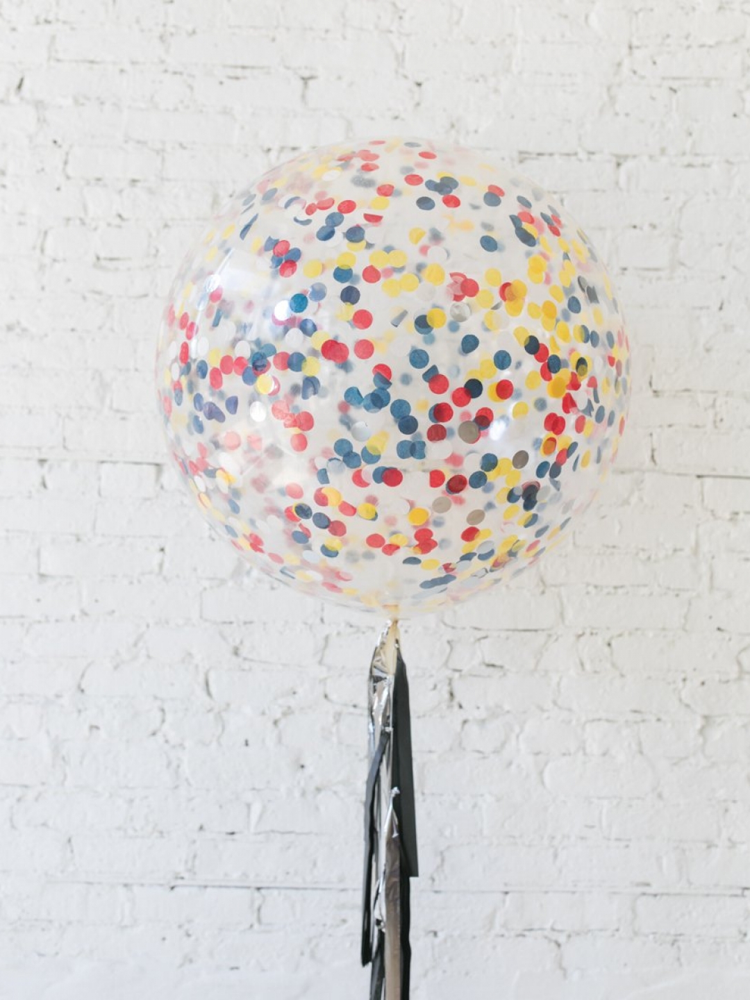 Большой шар с круглым конфетти (желтым,синим,красным,серебристым) на гирлянде