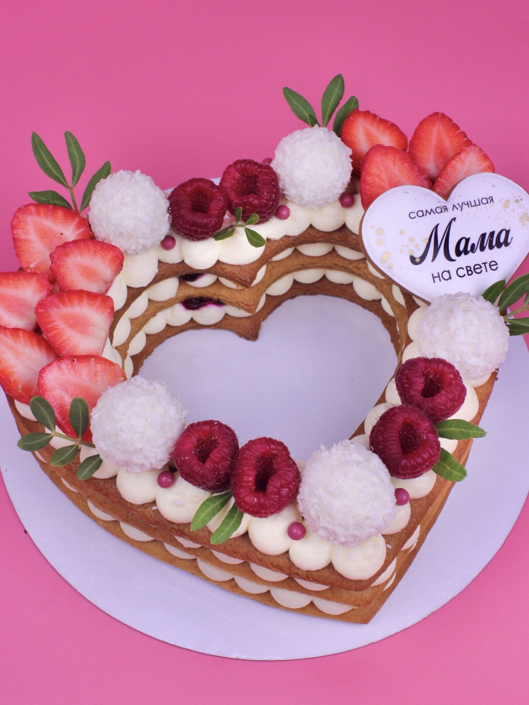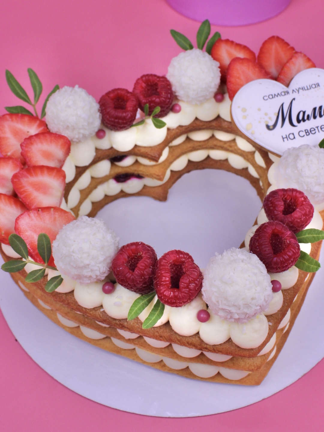 ⭐️Коржи (пшеничная мука высшего сорта, сахар, мёд натуральный цветочный, яйцо, сливочное масло 82,5%, соль, сода) ⭐️Крем (сыр маскарпоне, сливки 33%, творожный сыр, сахарная пудра) ⭐️Ягодная начинка: ягоды, сахар, пектин. ⭐️Декор - пряник с надписью, свежие ягоды, раффаэлло и хрустящие шарики.