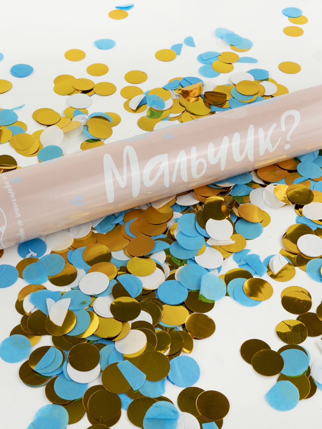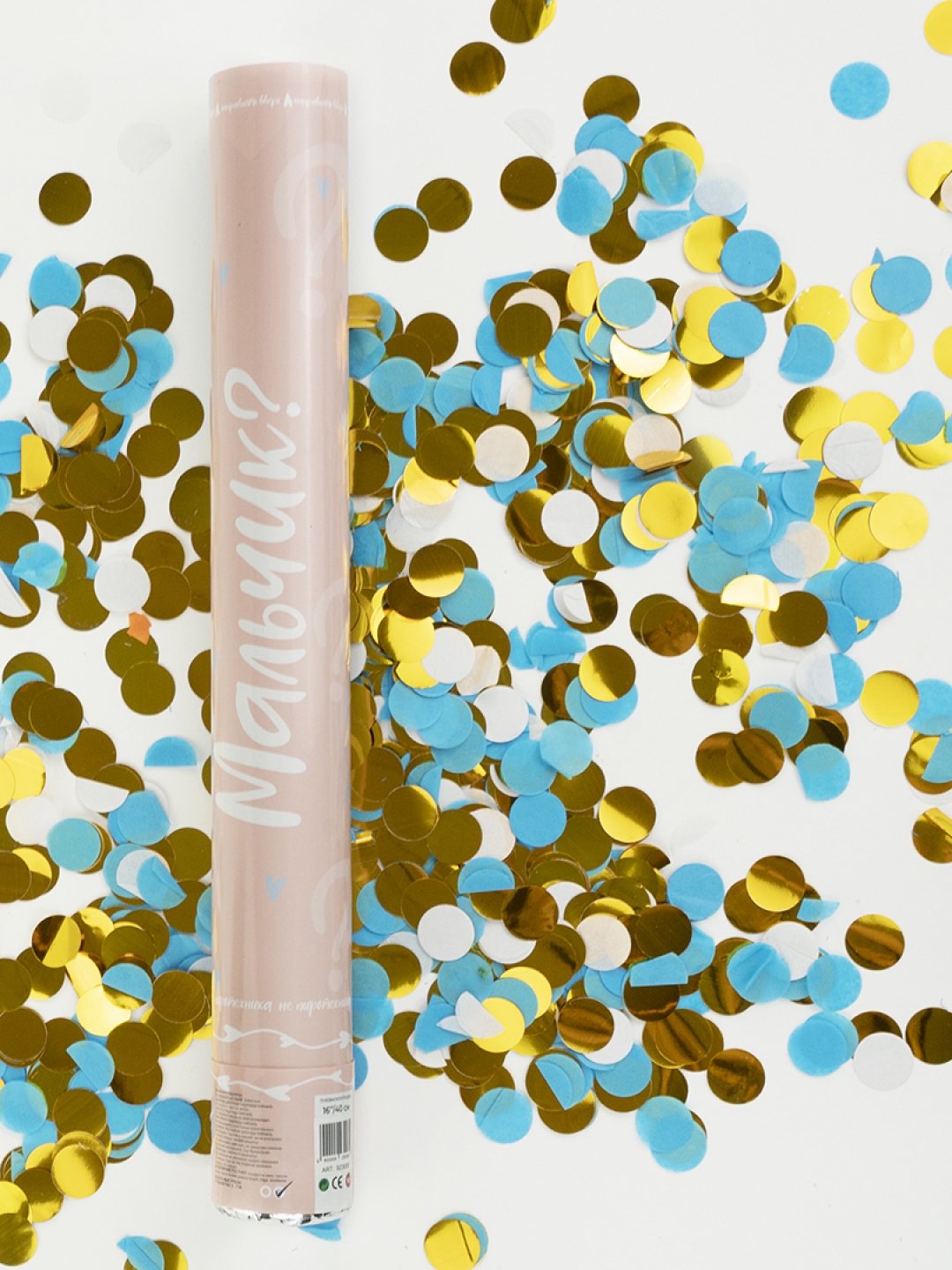 Пневмохлопушка 40 см, Гендер Пати, Это Мальчик, Круги фольга и тишью, Белый/Голубой/Золото